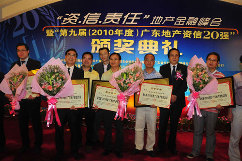5月28日,“‘資·信·責任’地產金融峰會暨第九屆(2010年度)廣東地產資信20強”頒獎典禮在廣州隆重舉行。工商銀行、農業銀行、中國銀行、建設銀行四大國有商業銀行廣東省分行聯合公布“第九屆(2010年度)廣東地產資信20強”,星河灣地產繼2006年及2008年之后,第三次獲得此項殊榮。此前,星河灣地產在2006年及2007年兩度榮獲“北京地產資信20強”。
